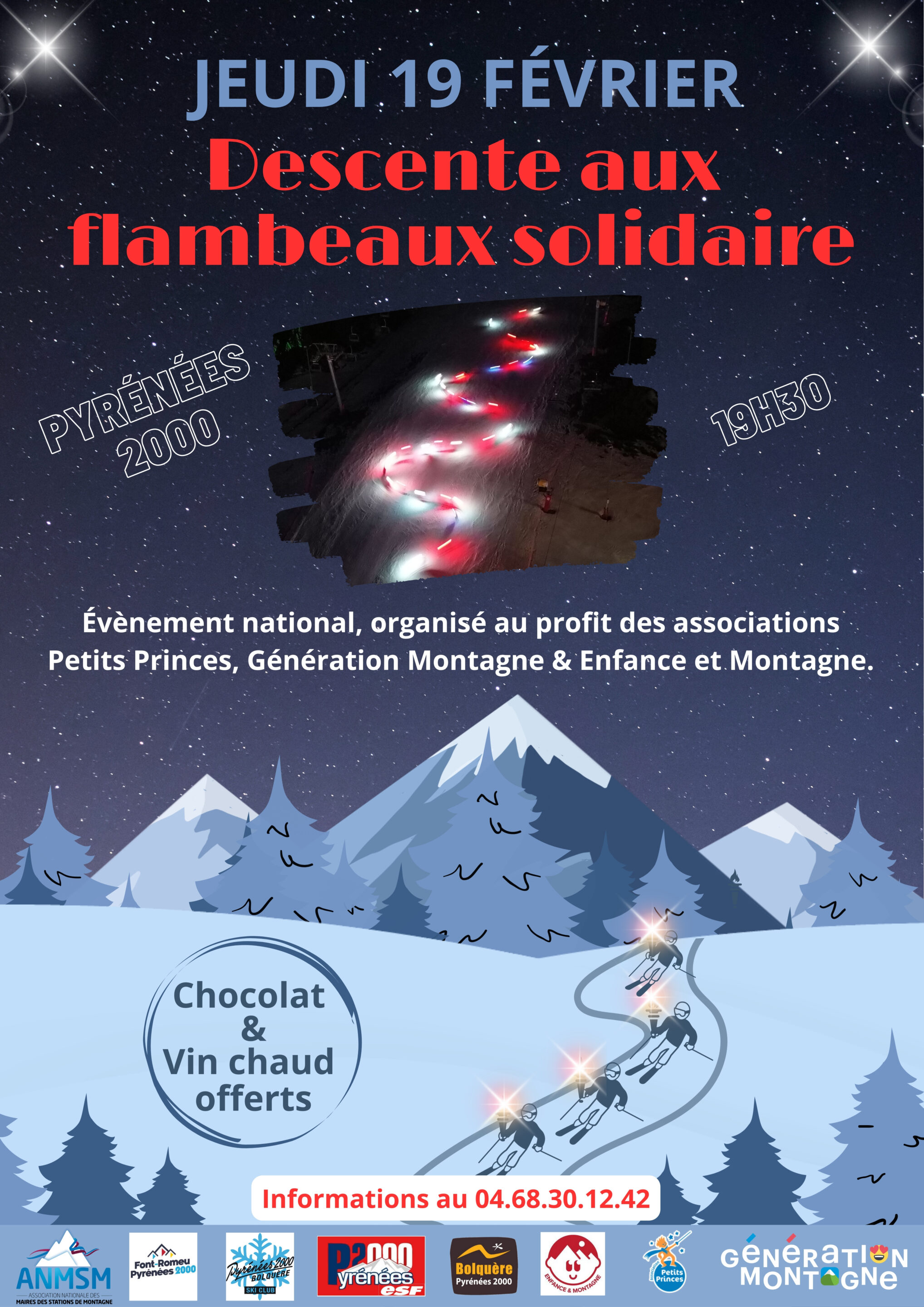 DESCENTE AUX FLAMBEAUX SOLIDAIRE 19h30 Front de neige, Pyrénées 2000 Venez participer à la traditionnelle descente aux flambeaux des moniteurs et monitrices de l’Ecole du Ski Français de Pyrénées 2000, accompagnés par les enfants du Ski Club de Bolquère Pyrénées 2000. L'intégralité des fonds seront reversés aux associations: "Petits Princes", "Génération Montagne" et "Enfance et Montagne" pour le réconfort et le bien-être des enfants malades ou défavorisés en leur faisant découvrir les joies de la montagne Chocolat chaud et vin chaud offert. Des étoiles plein les yeux, pour petits et grands !