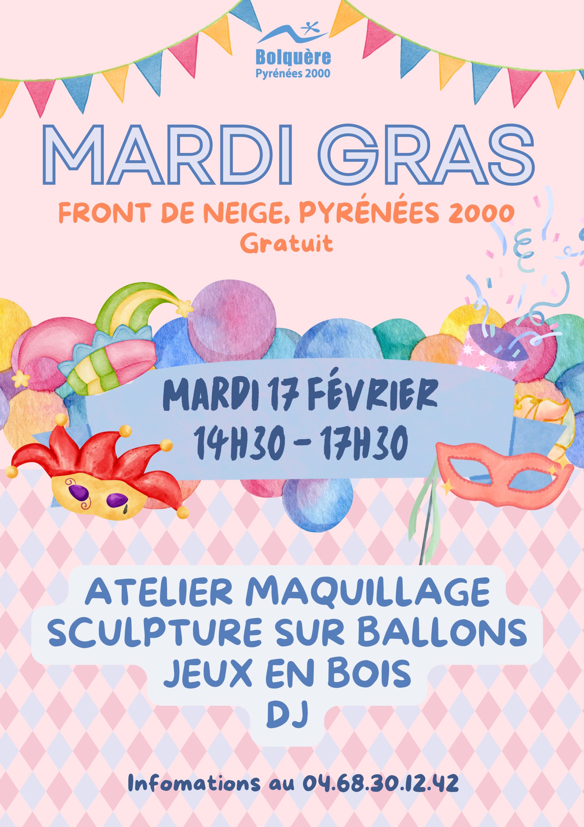 VENEZ FÊTER MARDI GRAS ! 14H30 - 17H30 Front de neige, Pyrénées 2000 Gratuit. En famille. De nombreuses animations pour petits et grands vous attendent au pied des pistes : jeux en bois, maquillage, sculptures sur ballon…Stand Chocolatier Cemoi. Un après-midi placé sous le signe de la fête !