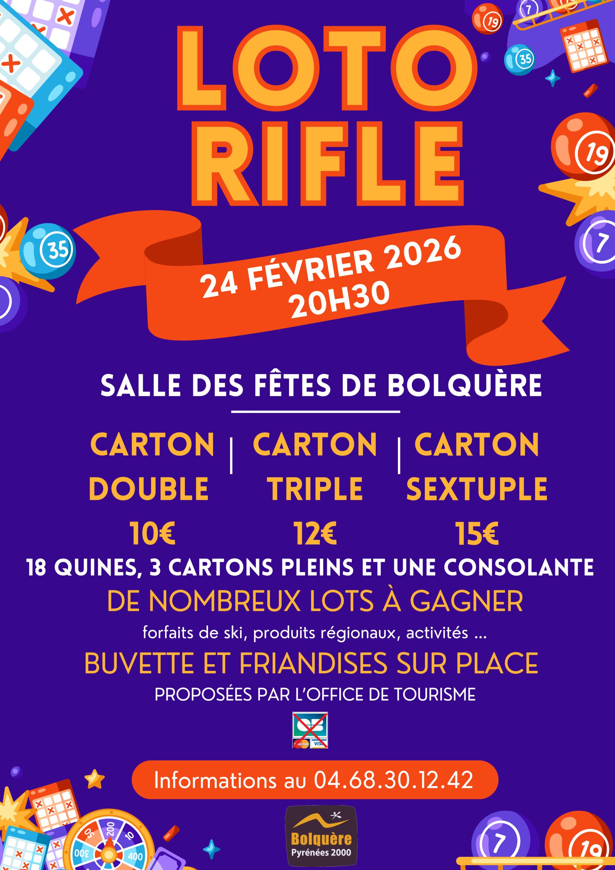 Rifle A 20h30 à la salle des fêtes de Bolquère Tarifs: Carton double: 10€ / Carton triple: 12€/ Carton sextuple: 15€. En famille Une soirée en 18 quines, 3 cartons pleins et une consolante. De nombreux lots sont à gagner (forfaits de ski Font-Romeu Pyrénées 2000, bons d'achats, produits régionaux, activités, ...). Buvette et friandises sur place. Qui remportera le gros lot?