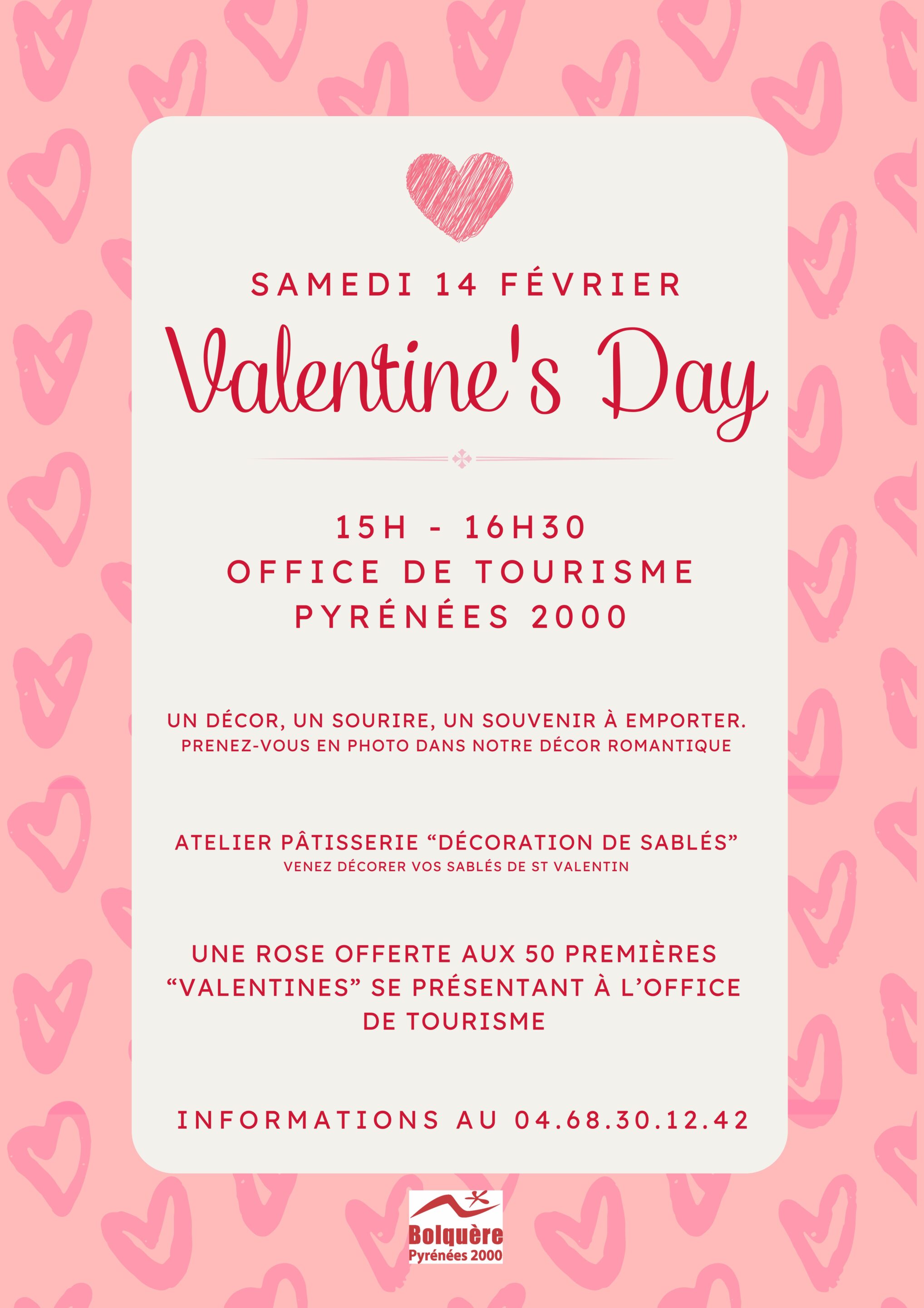 SAINT VALENTIN 15h - 16h30 / Office de Tourisme , Pyrénées 2000 Gratuit. En famille. Une rose offerte aux 50 premières valentines se présentant à l'Office de Tourisme Bolquère Pyrénées 2000. Atelier pâtisserie, " décorations de sablés Saint Valentin" Un décor, un sourire, un souvenir à emporter : prenez-vous en photo dans notre cadre romantique.