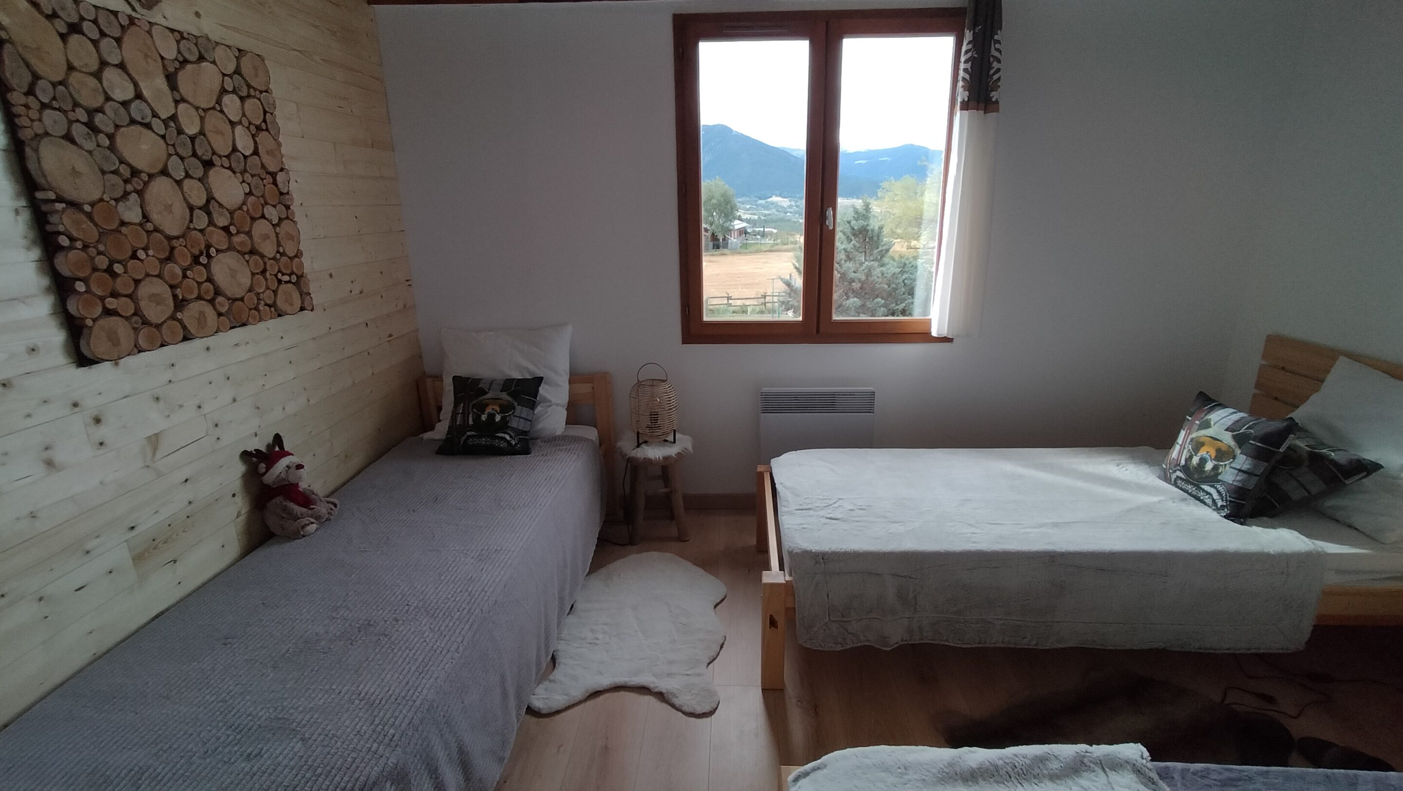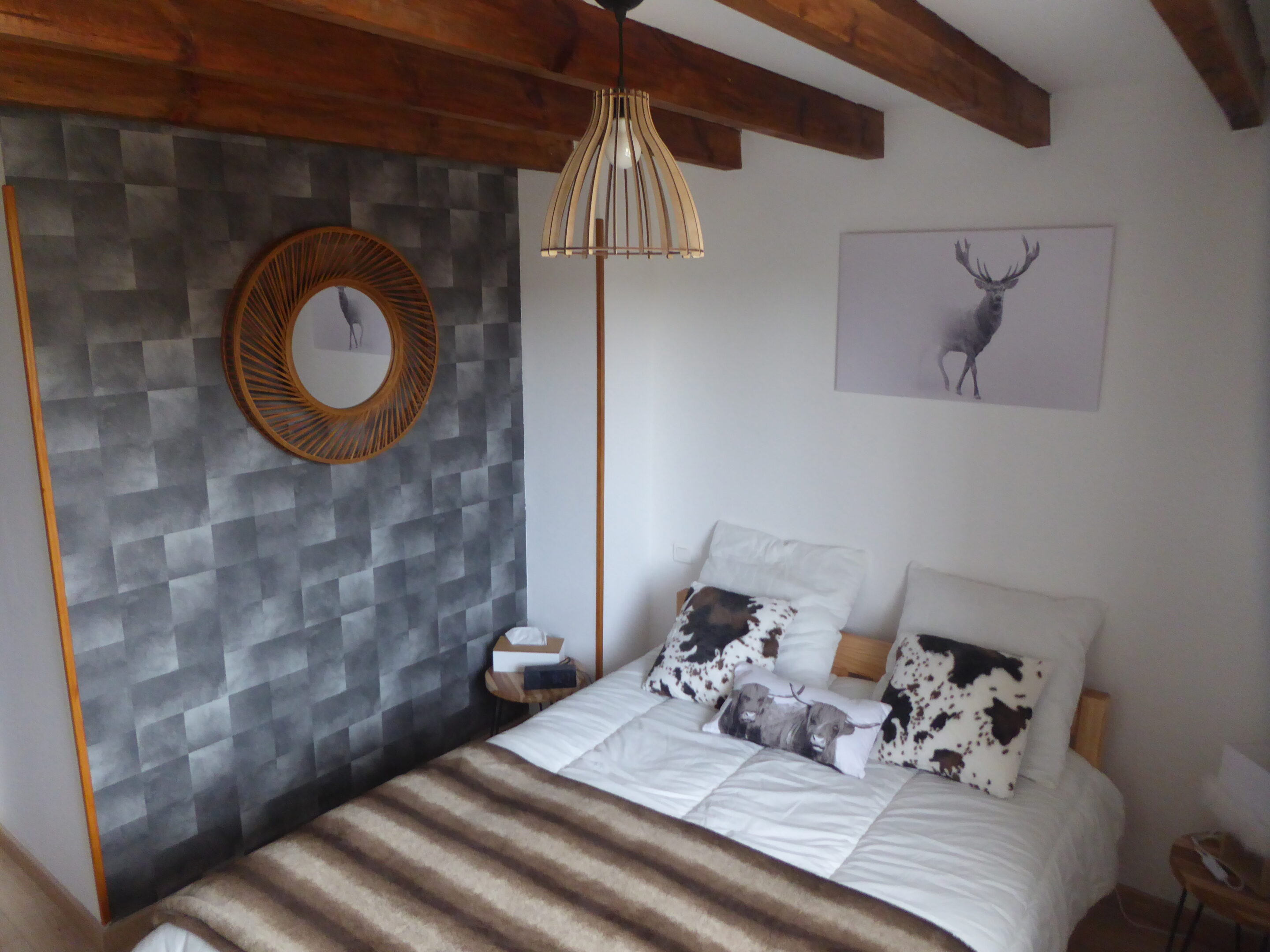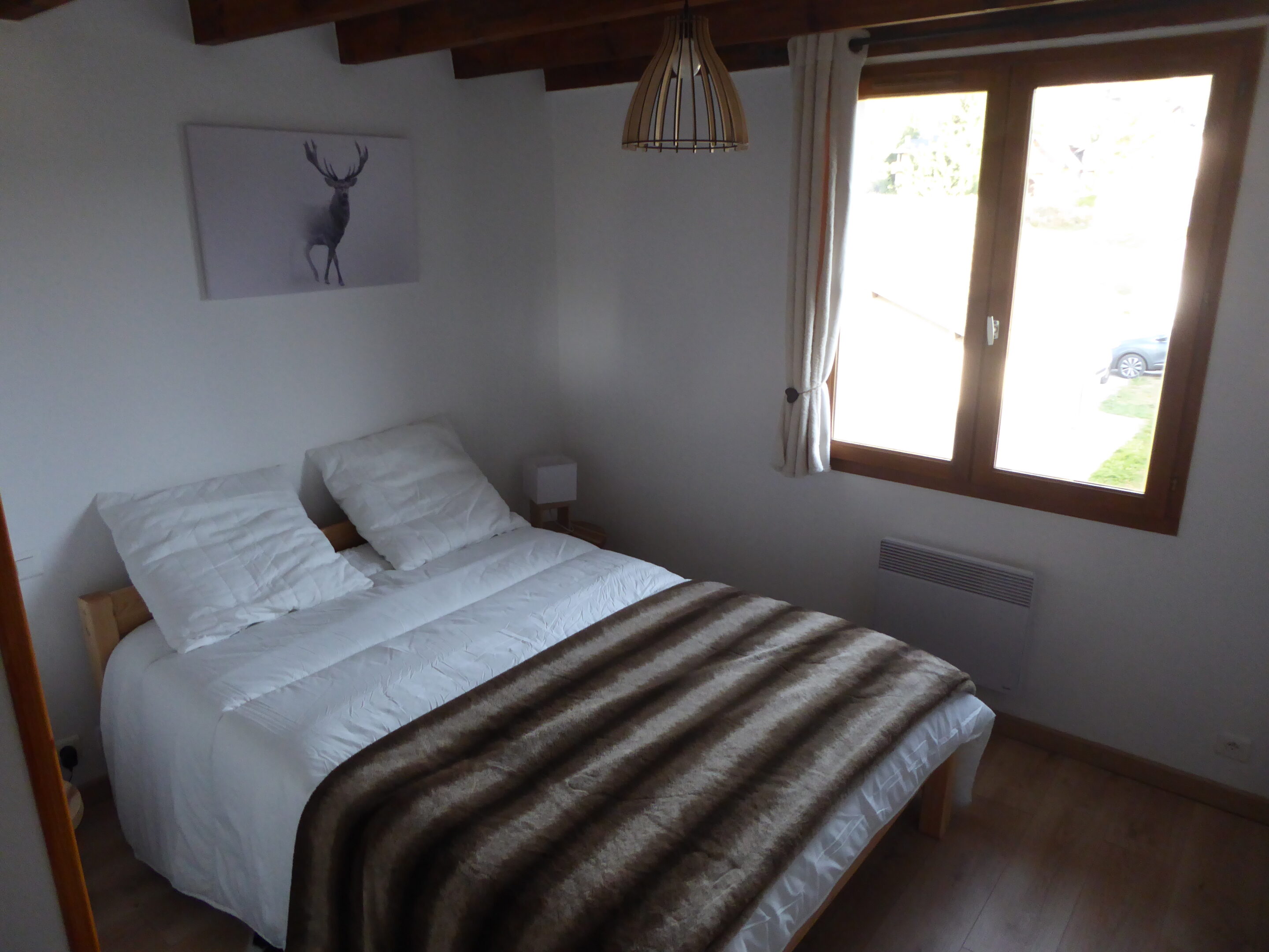 À l’étage, chambre coté rue avec lit en 140×190 et chambre coté jardin avec vue sur Cambre d’Aze trois lits en 80×200. Les draps et linges de toilette ne sont pas fournis.