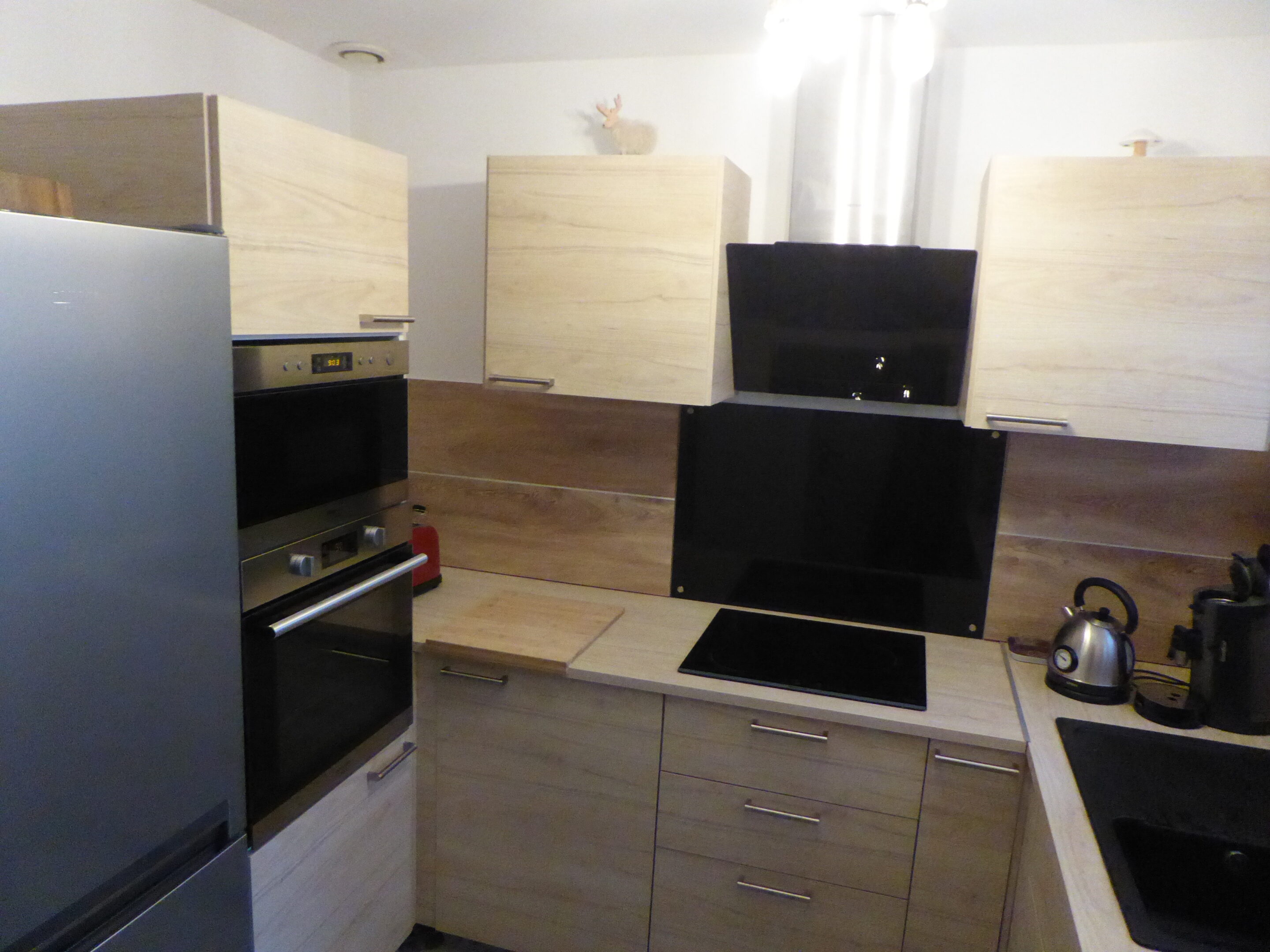Au rez-de-jardin sas d’entrée. cuisine entièrement équipée avec four micro-ondes, four pyrolyse, lave-vaisselle, plaque induction trois feux, frigo avec congélateur, grille-pain, Senseo, cafetière à filtre, mixer, autocuiseur, lave linge…