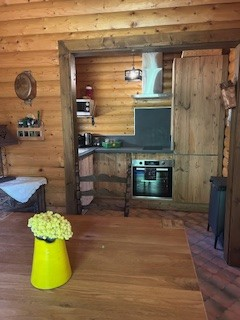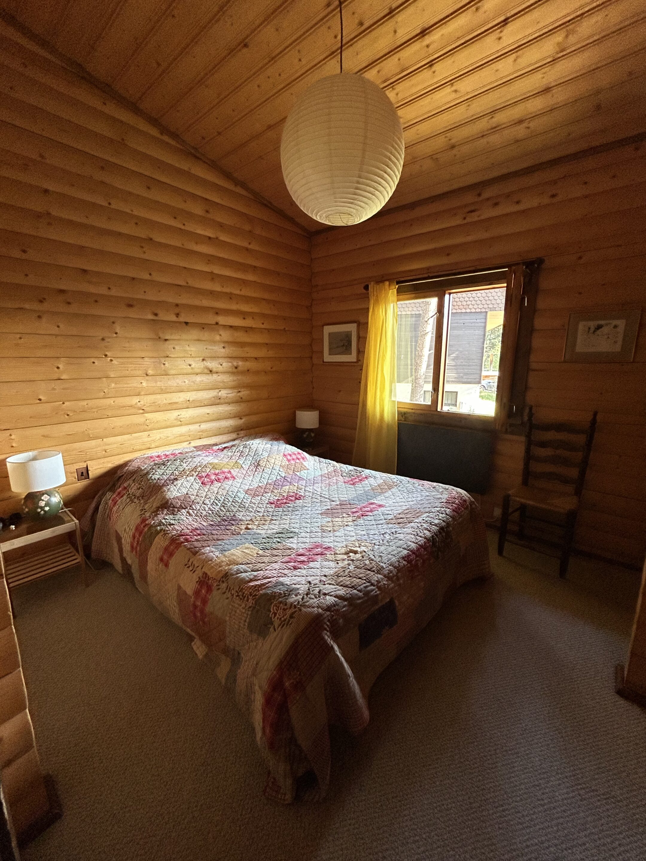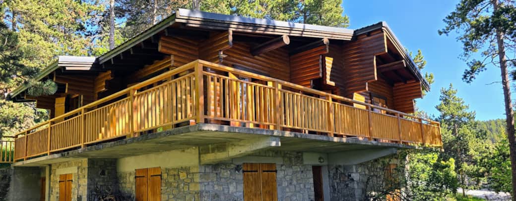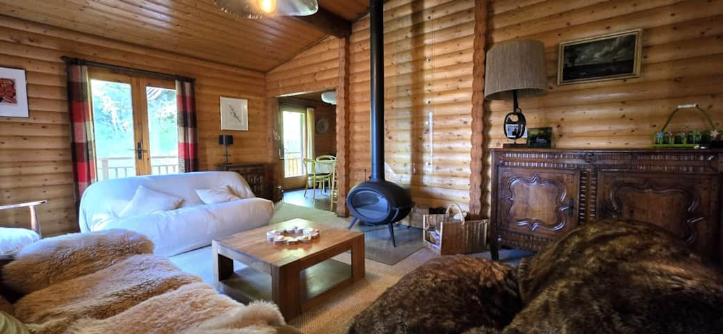 Vous apprécierez le calme depuis la grande terrasse avec vue sur le Cambre d’Aze, le confort d’une construction en bois et la chaleur du poêle.